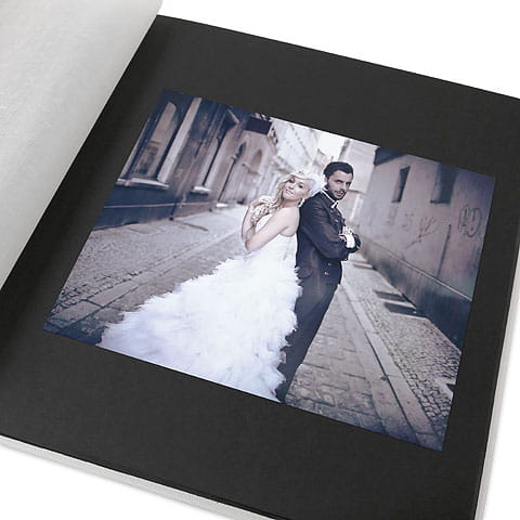 Wewnątrz albumu znajdują się karty w kolorze czarnym matowym, pozwalające na wklejenie zdjęć w układzie poziomym oraz pionowym. Karty zostały wykonane z eleganckiego kartonu barwionego w masie, o gramaturze 300g/m2 - co gwarantuje odpowiednią trwałość albumu.